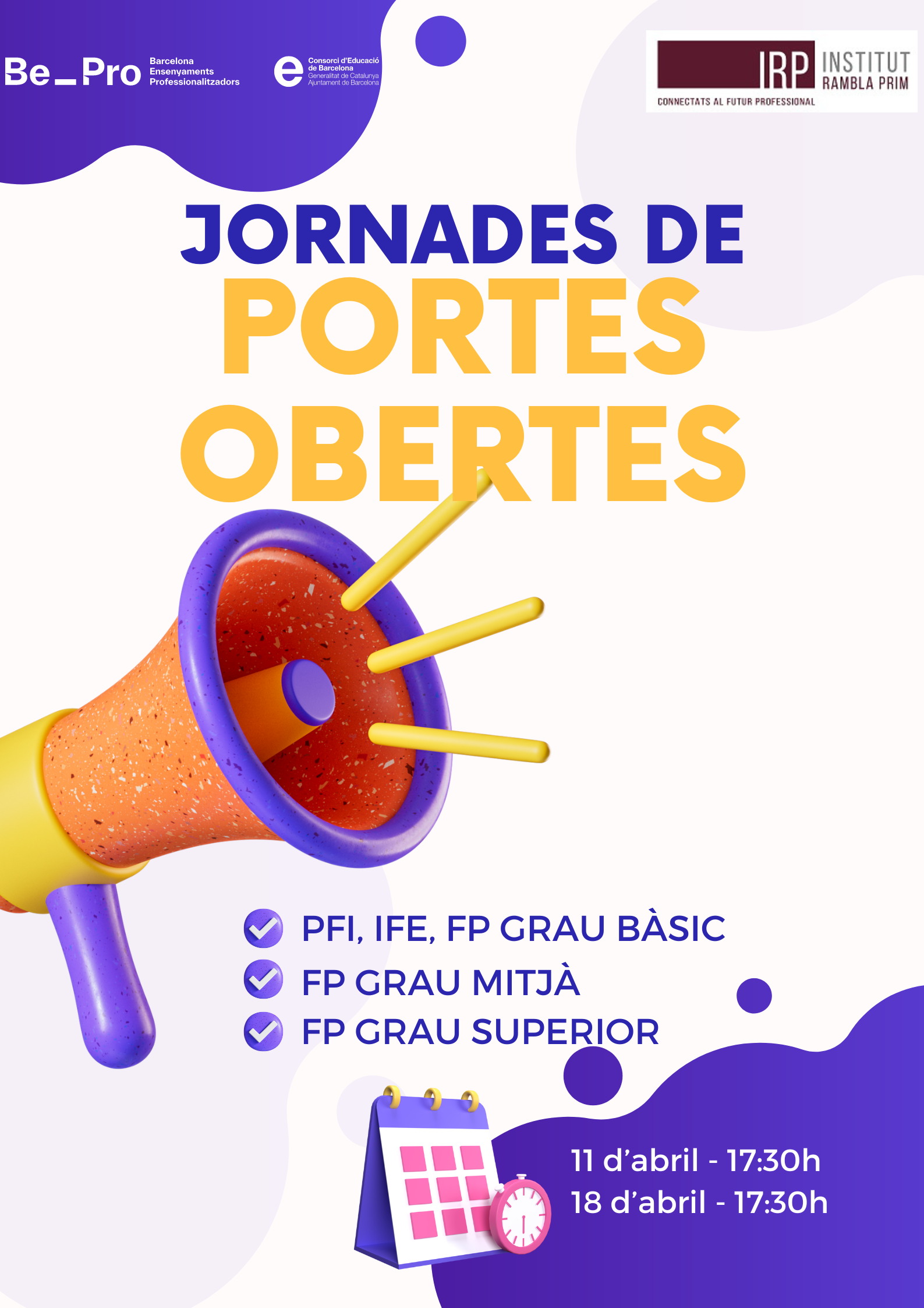Els propers 11 i 18 d'abril es realitzaran les jornades de portes obertes del centre. Es realitzaran en format presencial. 11 d'abril a les 17:30 h: PFI, IFE, FP GRAU BÀSIC, FP GRAU MITJÀ 18 d'abril a les 17:30h: FP GRAU[...]